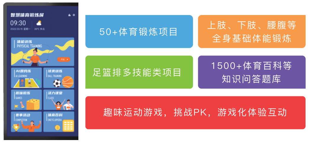 同时享受学问性和趣味性。5、活力四溢的讲堂讲授:立异多人接龙、体育功课及体能讲授等模式,努力于用趣味化和强交互的熬炼提拔学生熬炼乐趣取习惯。AI易活动熬炼屏供给体能锻炼、球类活动、趣味熬炼、活力讲堂、AI跟我练、体育百科、排行榜等模块,为学生的身心健康保驾护航。